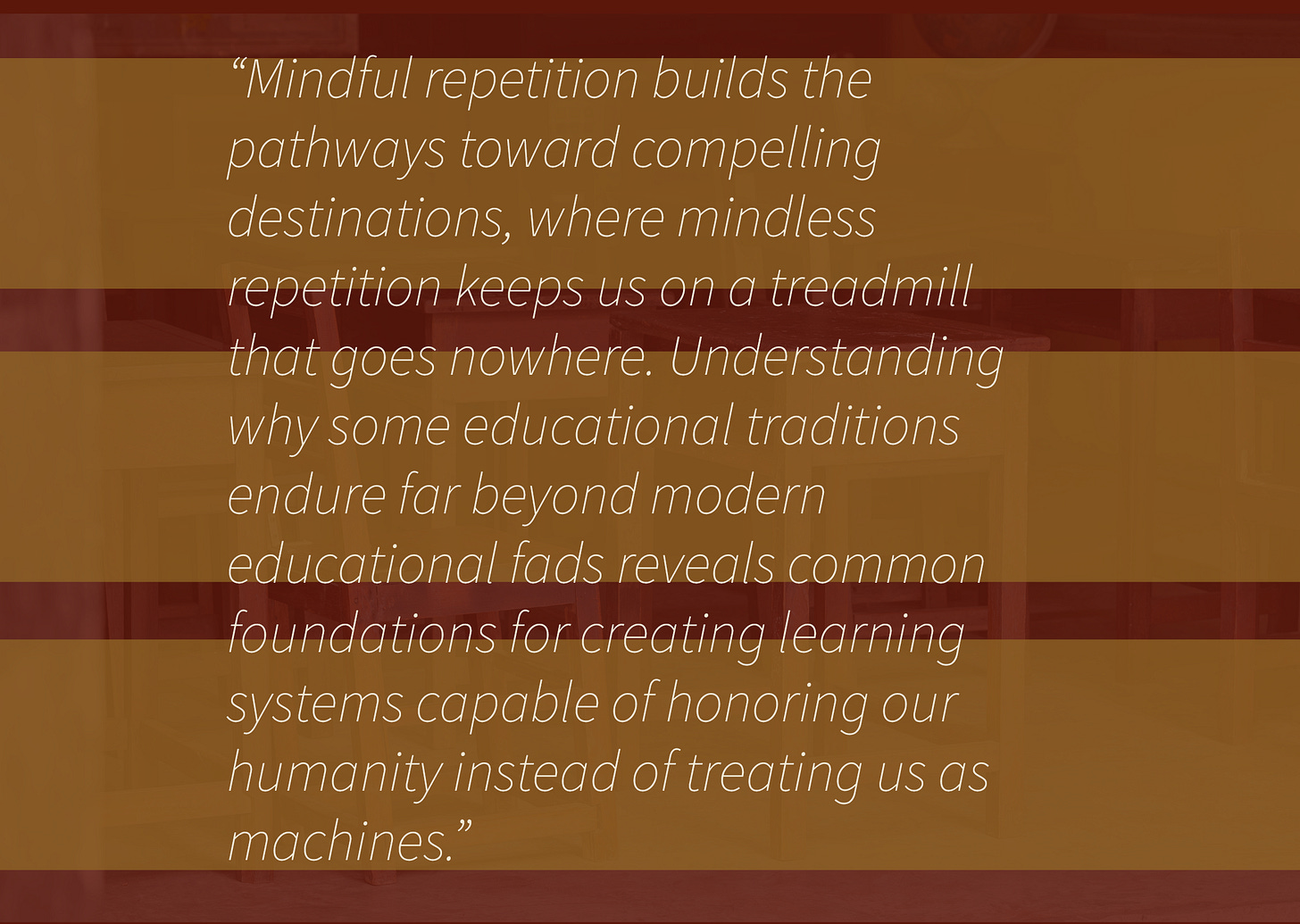 Mindful repetition builds the pathways toward compelling destinations, where mindless repetition keeps us on a treadmill that goes nowhere. Understanding why some educational traditions endure far beyond modern educational fads reveals common foundations for creating learning systems capable of honoring our humanity instead of treating us as machines. When we strive for mastery and integration of knowledge and skill into our complete being, we open the doors to deep levels of satisfaction in our learning, customized to each person’s life.