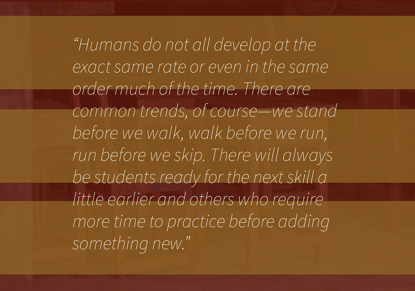 Humans do not all develop at the exact same rate or even in the same order much of the time. There are common trends, of course—we stand before we walk, walk before we run, run before we skip. There will always be students ready for the next skill a little earlier and others who require more time to practice before adding something new. There will be students fascinated by a particular topic before it’s ever introduced, and others who have never heard of it until a teacher brings it to their attention. Accepting that we are teaching individual human beings, not machines, is essential for any learning environment that seeks for each of the learners to thrive.