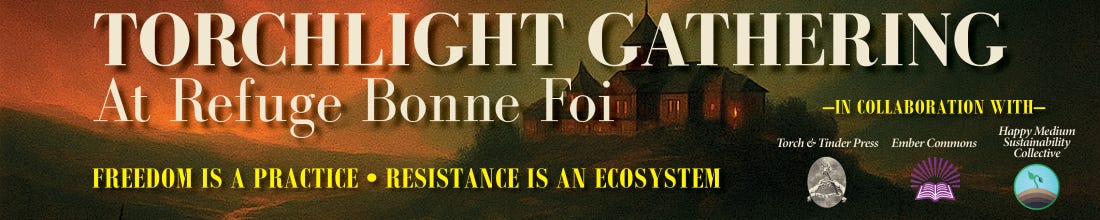 The Torchlight Gathering is hosted in Refuge Bonne Foi, with collaborators from Torch & Tinder Press, the Happy Medium Sustainability Collective, and Ember Commons, each carrying their own flame into the circle.